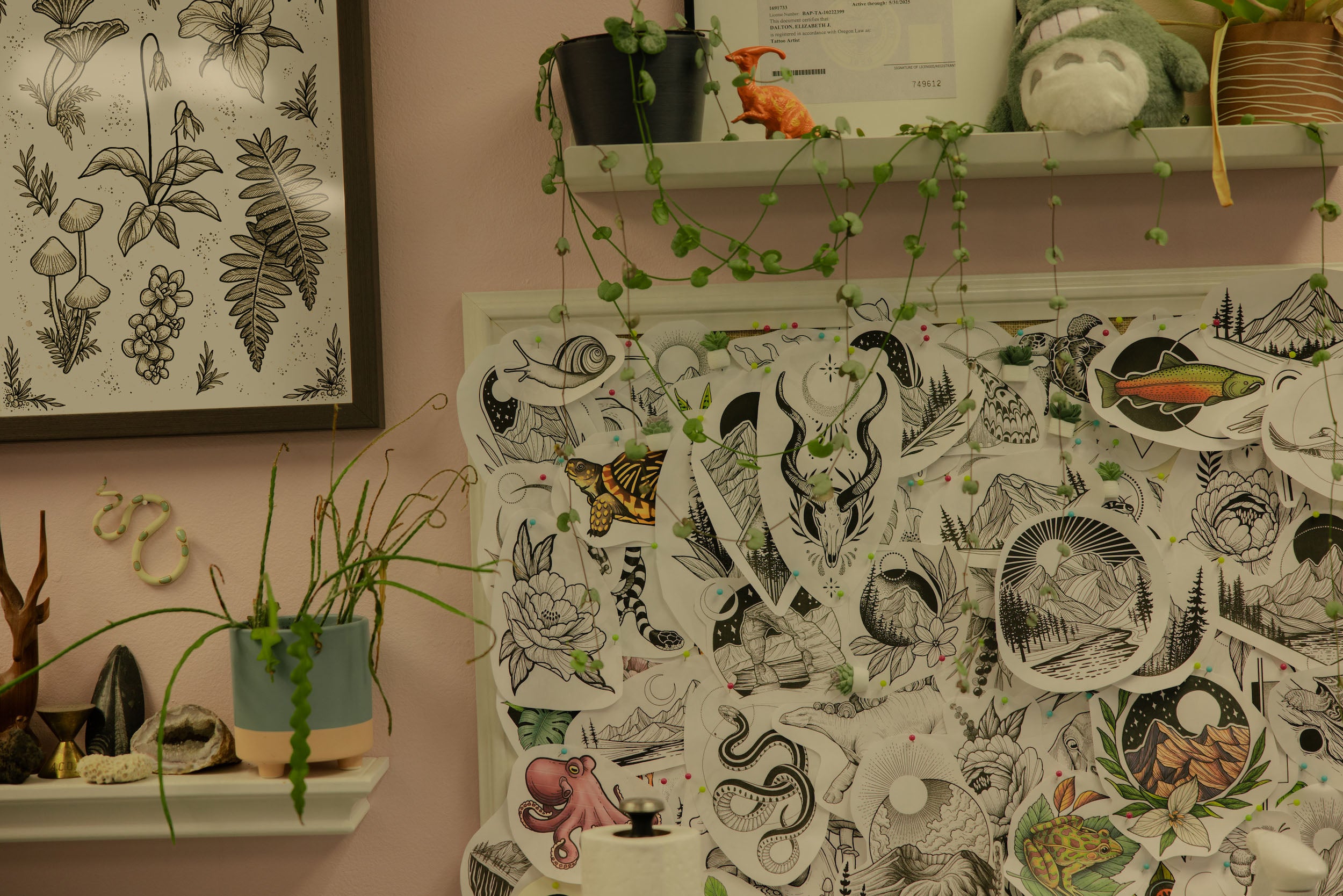 I'm Lizzy Dalton, a female, neurodivergent tattoo artist based in Portland, Oregon. I love rock climbing, mountains, and spending time the outdoors. I'm most known for my detailed woodcut-inspired tattoo style, and my depictions of landscapes, botanicals, animals, and anything from the natural world.